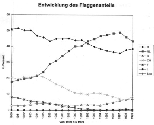 Der Anteil der deutschen Schiffe steht im eigenen Land mit 38,8 % lediglich an zweiter Stelle. Die Schiffszahl ist sogar rückläufig: Sie ist zwischen 1980 und 1999 um ganze 12,2 % gesunken (siehe M12).